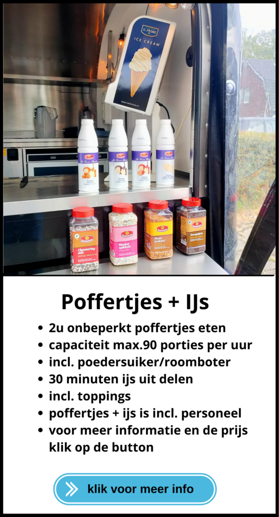 Onze poffertjes foodtruck zetten wij bij u op en binnen een mum van tijd staan wij bij u te bakken.