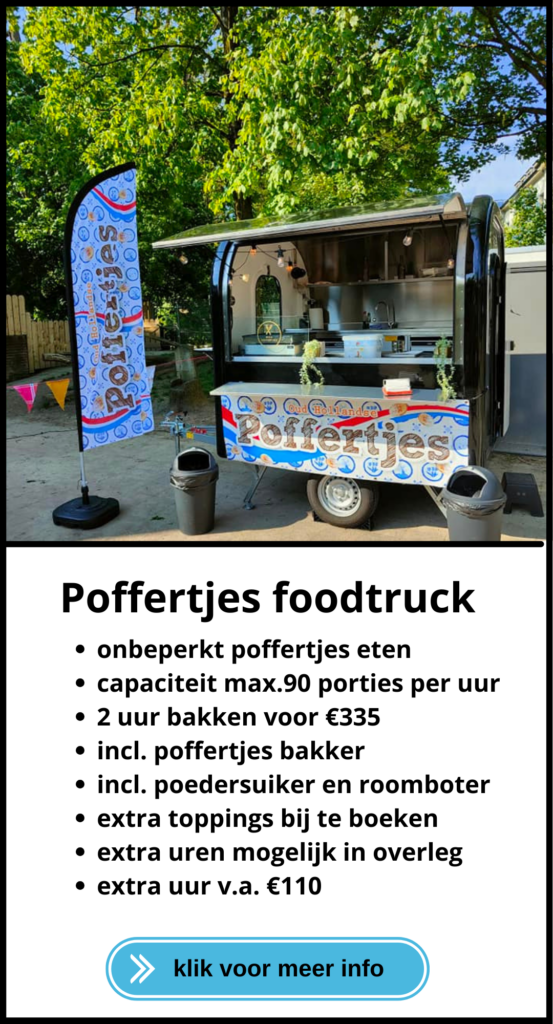 U kan ook de poffertjes foodtruck of marktkraam huren met een set speaker boxen. Hierdoor krijgt u een gezellige sfeer en komen de gasten/kinderen misschien nog een dansje wagen.