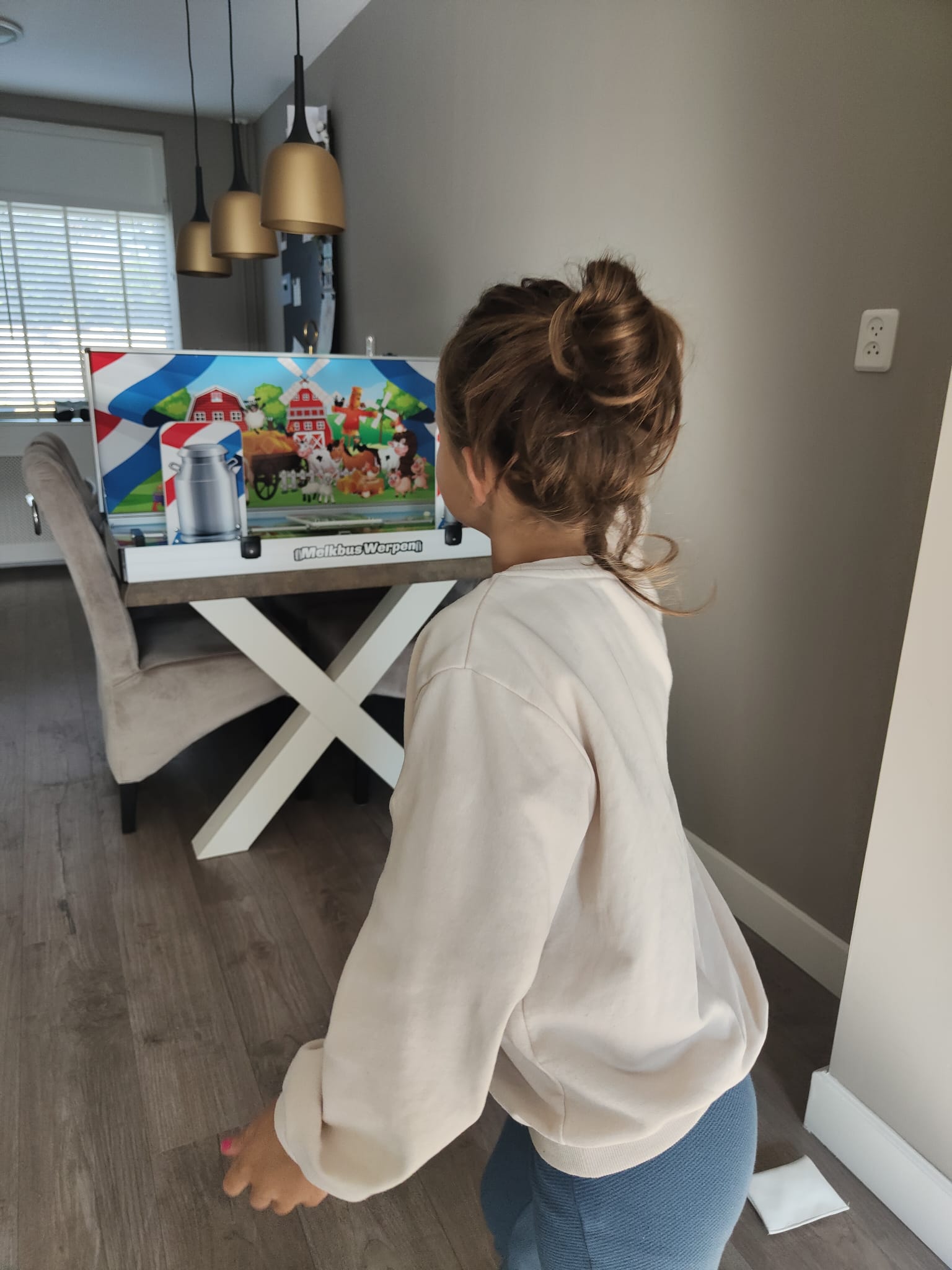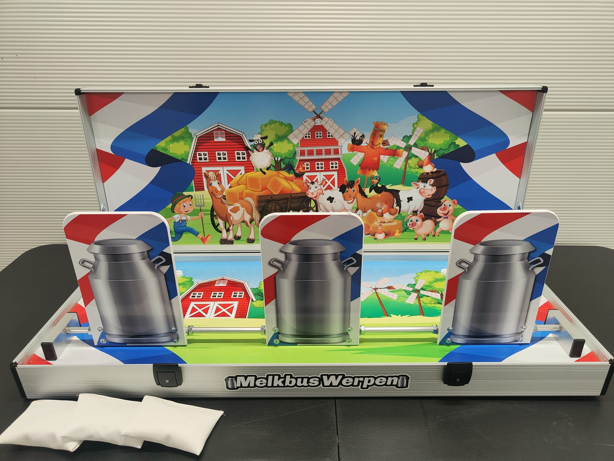 Melk bus werpen vanuit een koffer model. Koffer openen, melk bussen op zijn plaats en gooien maar!